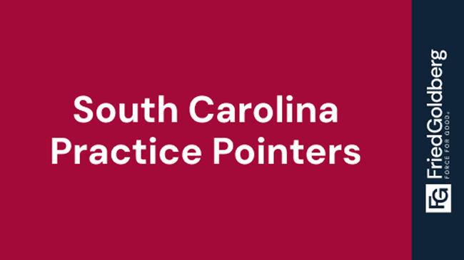 Fried Goldberg LLC has attorneys admitted in South Carolina and we have developed a series of helpful hints for practicing personal injury law. We include references to South Carolina statutes and case law in order to provide insights for newer attorneys interested in improving their skills.